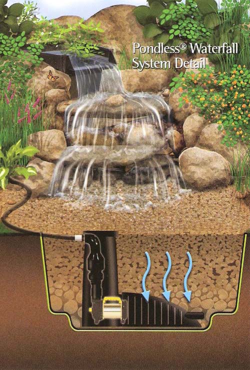 - Since the water level never pools above the level of the rock and gravel fill, it gives the appearance of a Pondless® Waterfall.