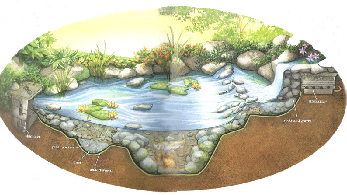 A hole, deeper than a normal pond, is dug, then lined and filled with rock, gravel and water. The water is then circulated from beneath the rocks and gravel by a pump that sirs on the bottom.